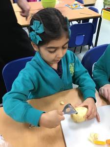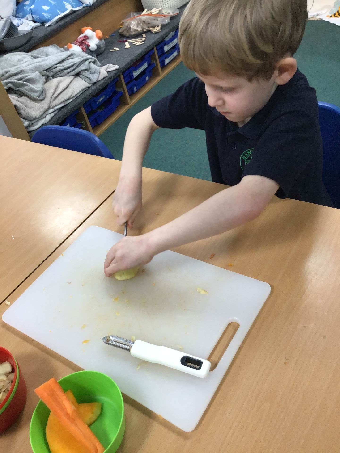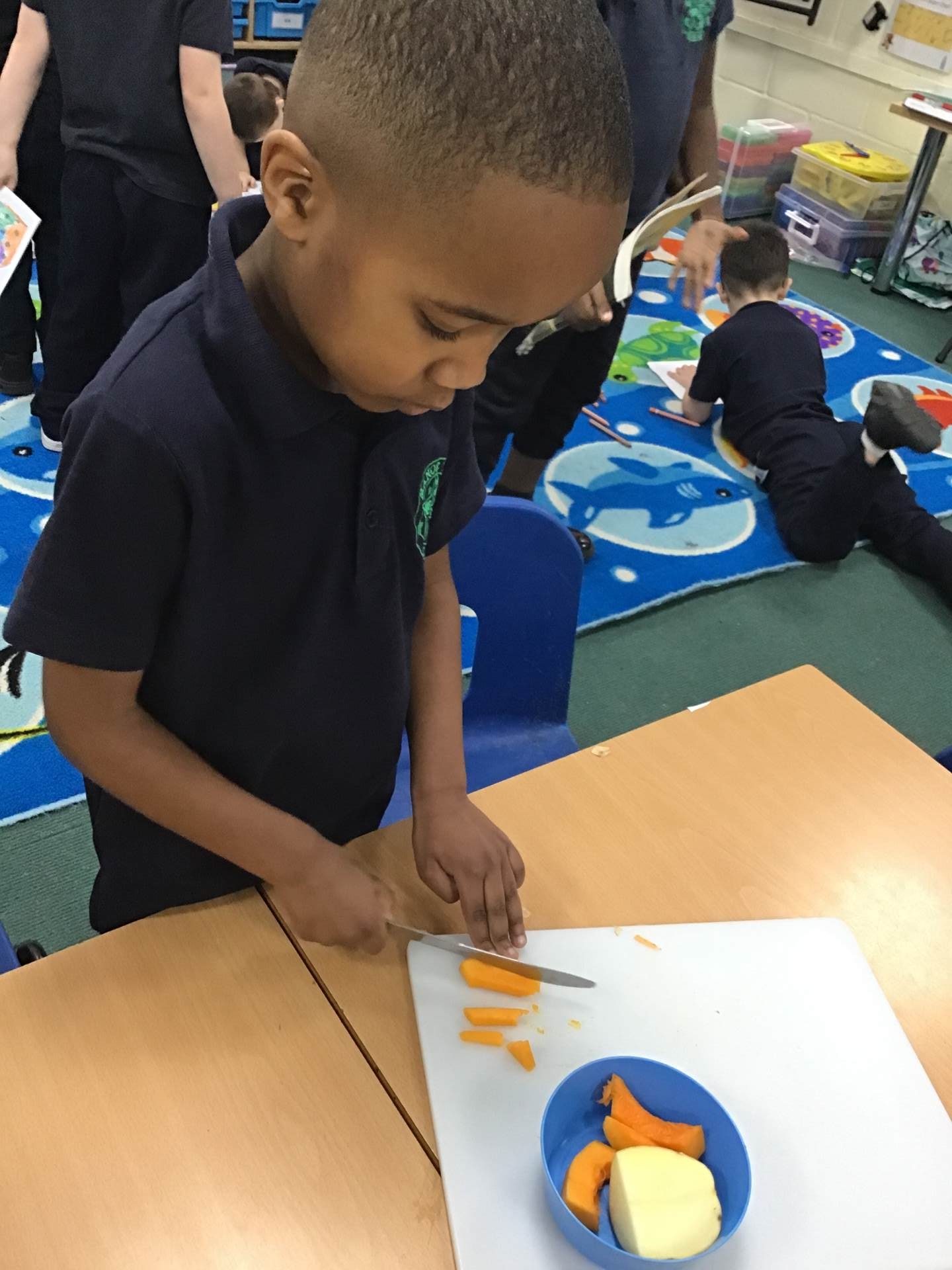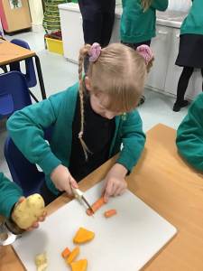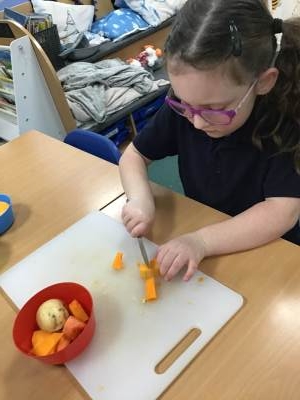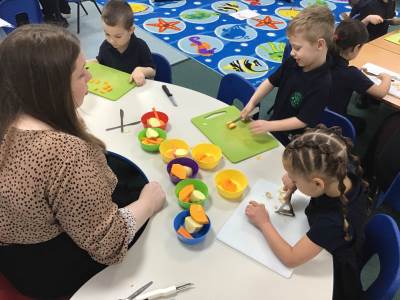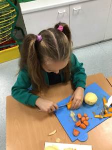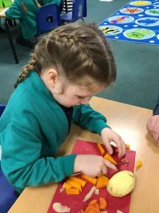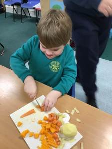 The children discover a tuff tray with a range of different Autumnal objects, the book Pumpkin Soup by Helen Cooper and a range of autumnal items and ingredients. On reading the story the children discover that the animals needed to work as a team to make the soup. Could we try to make soup for an Autumn celebration? What do we need to learn and do?